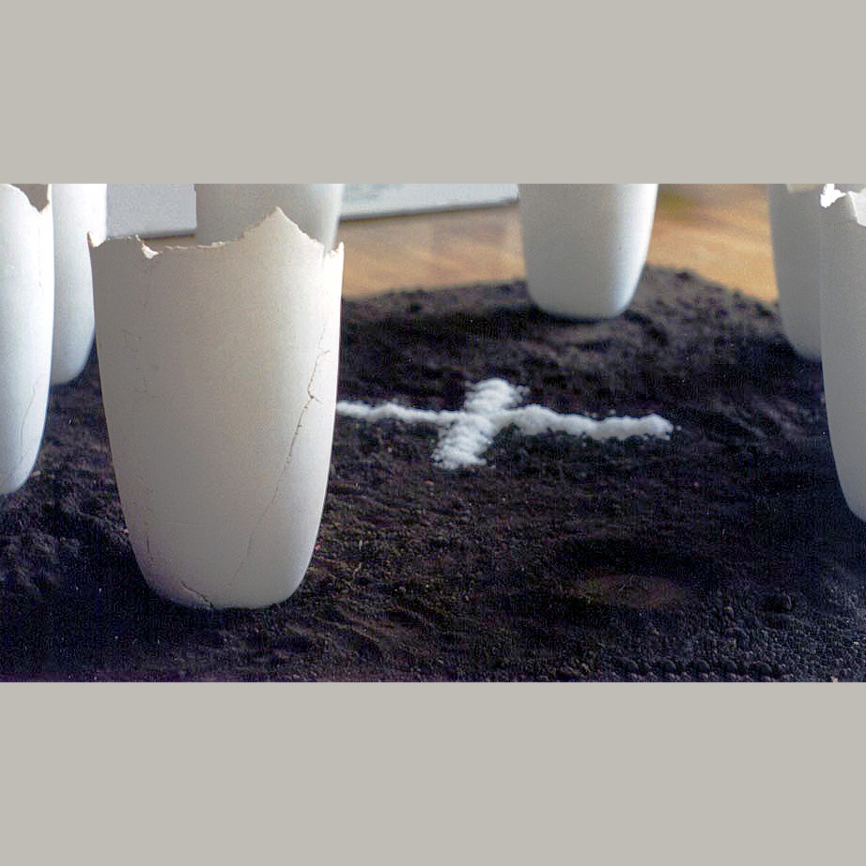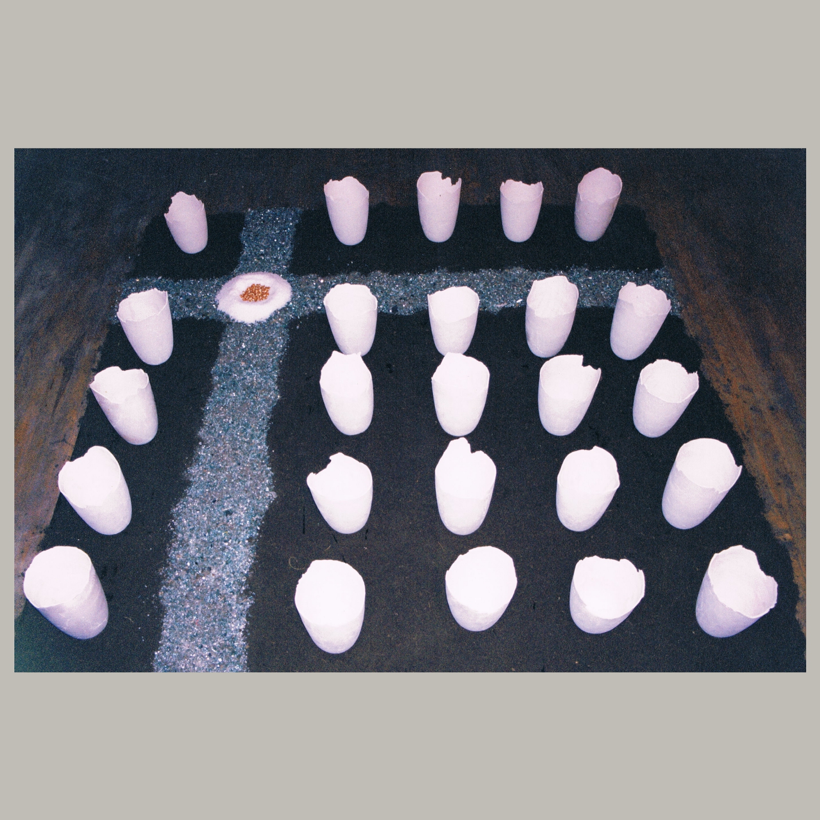 Céramique non émaillée, terre, verres en morceaux,sel et grains de maïz