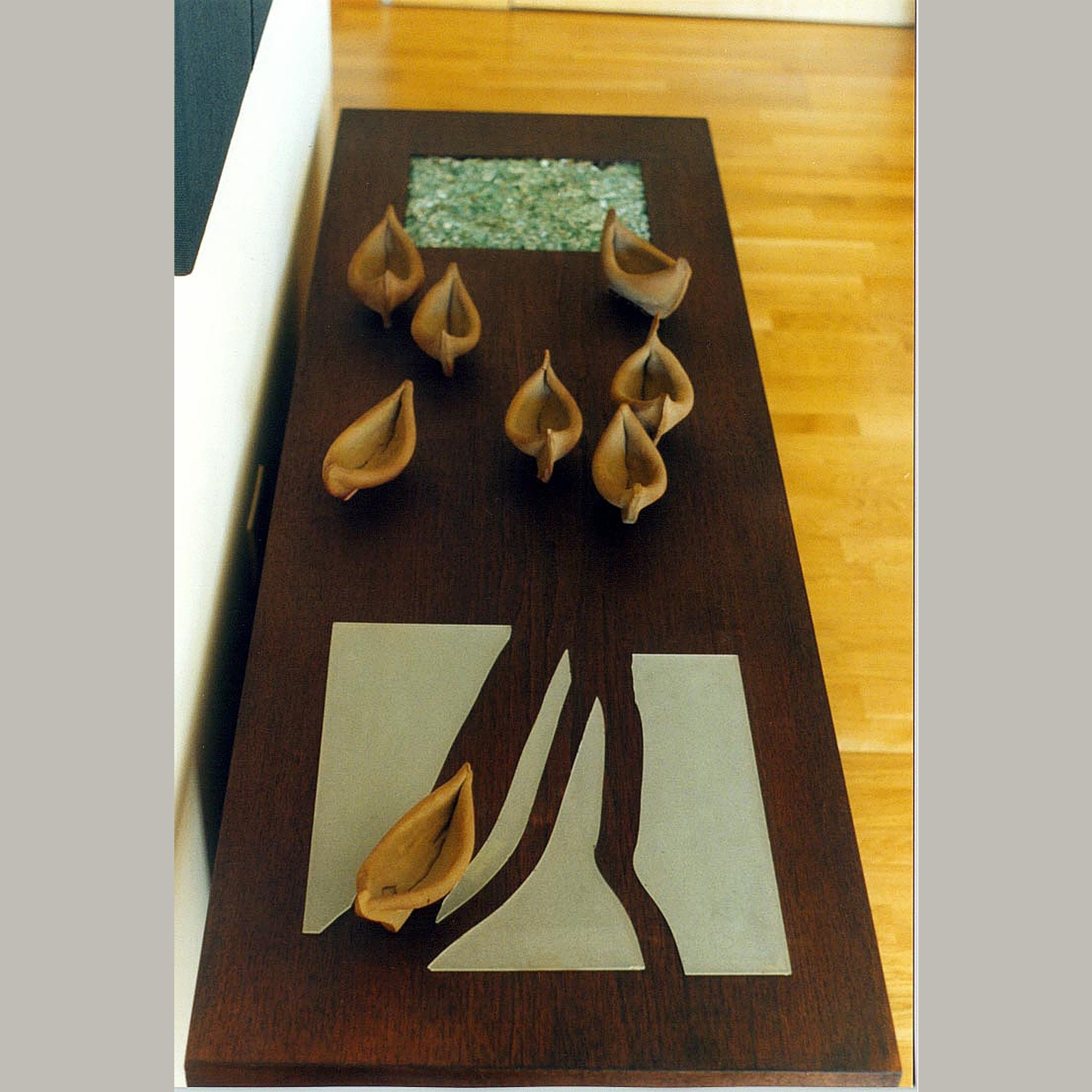 Grès, verre en morceaux, table